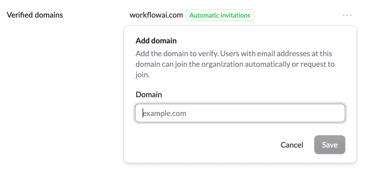 Note: A verified domain cannot be a disposable domain or common email provider. For example, you cannot create a verified domain for @gmail.com.